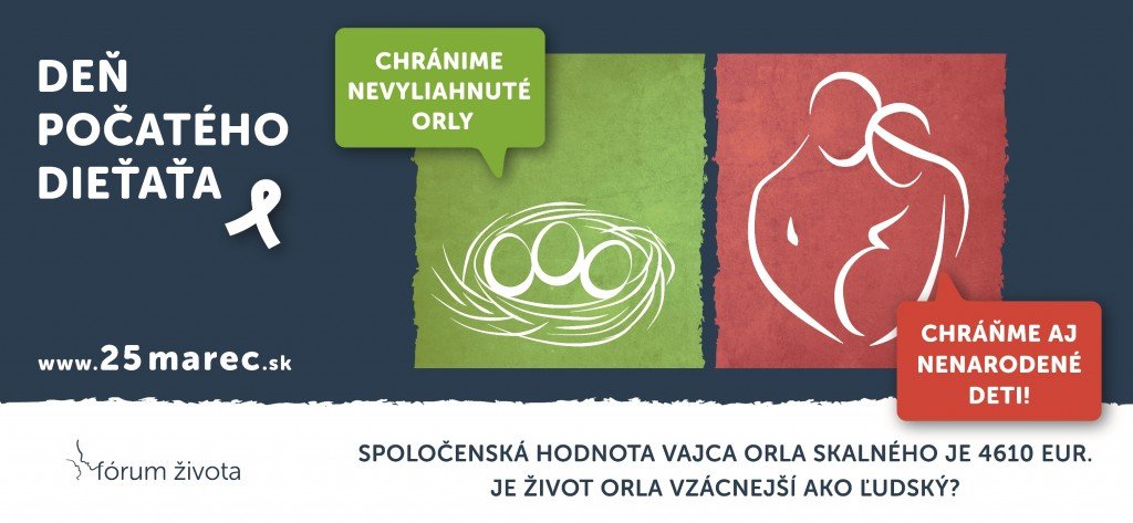 “Chránime nevyliahnuté orly. Chráňme aj nenarodené deti!” – tak znie hlavné motto občianskej kampane „25. marec – Deň počatého dieťaťa“ pre rok 2015, ktorú tradične organizuje občianske združenie Fórum života s partnermi počas marca a apríla. Jej cieľom je už po pätnásty raz šíriť úctu k ľudskému životu od momentu počatia, zdvihnúť hlas na obranu tých, ktorí sa ešte sami brániť nemôžu a mobilizovať spoločnosť k podpore a pomoci pre deti a celé rodiny. Viac TU.
